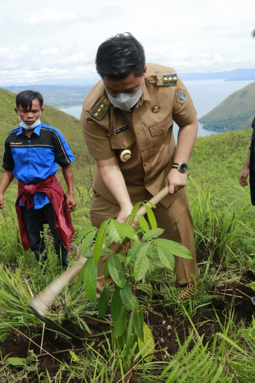 Bupati Samosir Vandiko T. Gultom bersama IALUSIDO dan PPRTB melakukan penanaman 1.000 Pohon di Desa Tamba Dolok, Kecamatan Sitiotio, Senin (18/10)/2021)/Foto: Diskominfo Samosir
